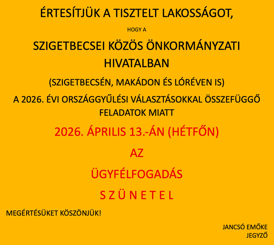 - 1. FONTOS VÁLTOZÁS: MAKÁD községben 2026. április 12.-én a KÖZSÉGHÁZÁN (2322 Makád, Kossuth Lajos utca 52. szám) lévő szavazóhelyiségben lehet szavazni.